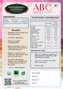 ஒருத்தருக்கு ஒரு டீஸ்பூன்(5 கிராம்) வீதம் பாரம்பரிய அமிர்தத்தின் ஏபிசி மால்ட் மிக்ஸ் எடுத்து 200 ml சூடான பால் அல்லது வெந்நீரில் கலந்து பருகலாம்.