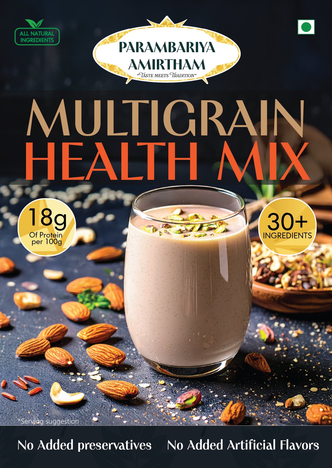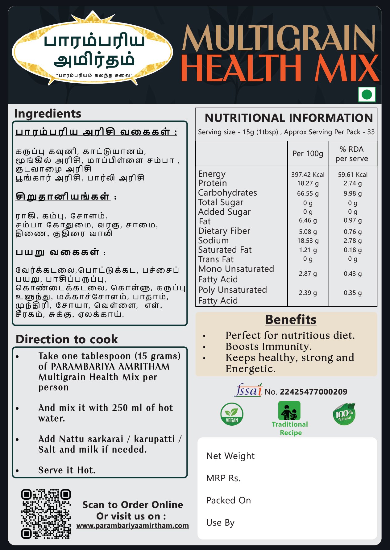 எல்லா வயதினருக்கும் ஏற்ற அனைத்து வகையான சத்துக்களும் நிறைந்த பாரம்பரிய அரிசி வகைகள், சிறுதானியங்கள் மற்றும் பயறு வகைகள் நிறைந்த மல்டி கிரேன் ஹெல்த் மிக்ஸ்
