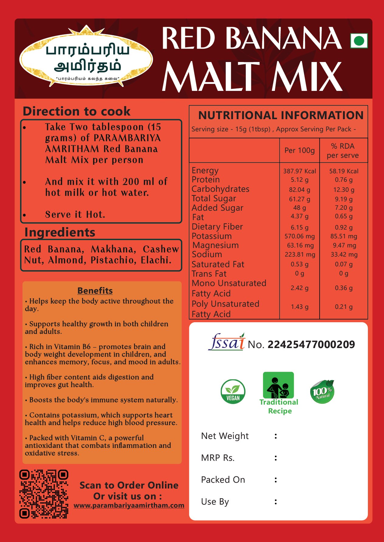 ஒருத்தருக்கு 2:டீஸ்பூன் (10 கிராம்) வீதம் பாரம்பரிய அமிர்தத்தின் செவ்வாழை மால்ட் மிக்ஸ் எடுத்து 200 ml சூடான பால் அல்லது வெந்நீரில் கலந்து பருகலாம்.